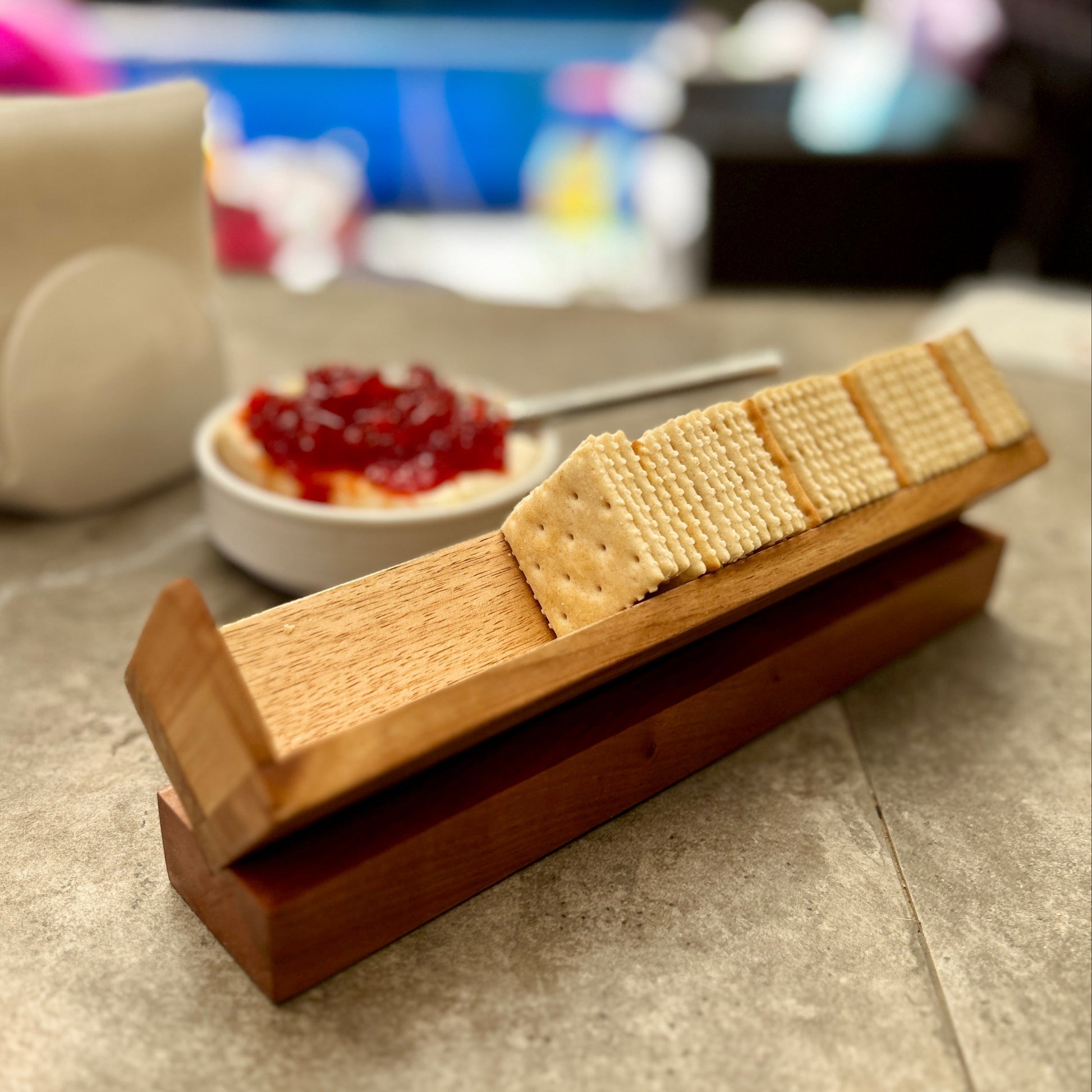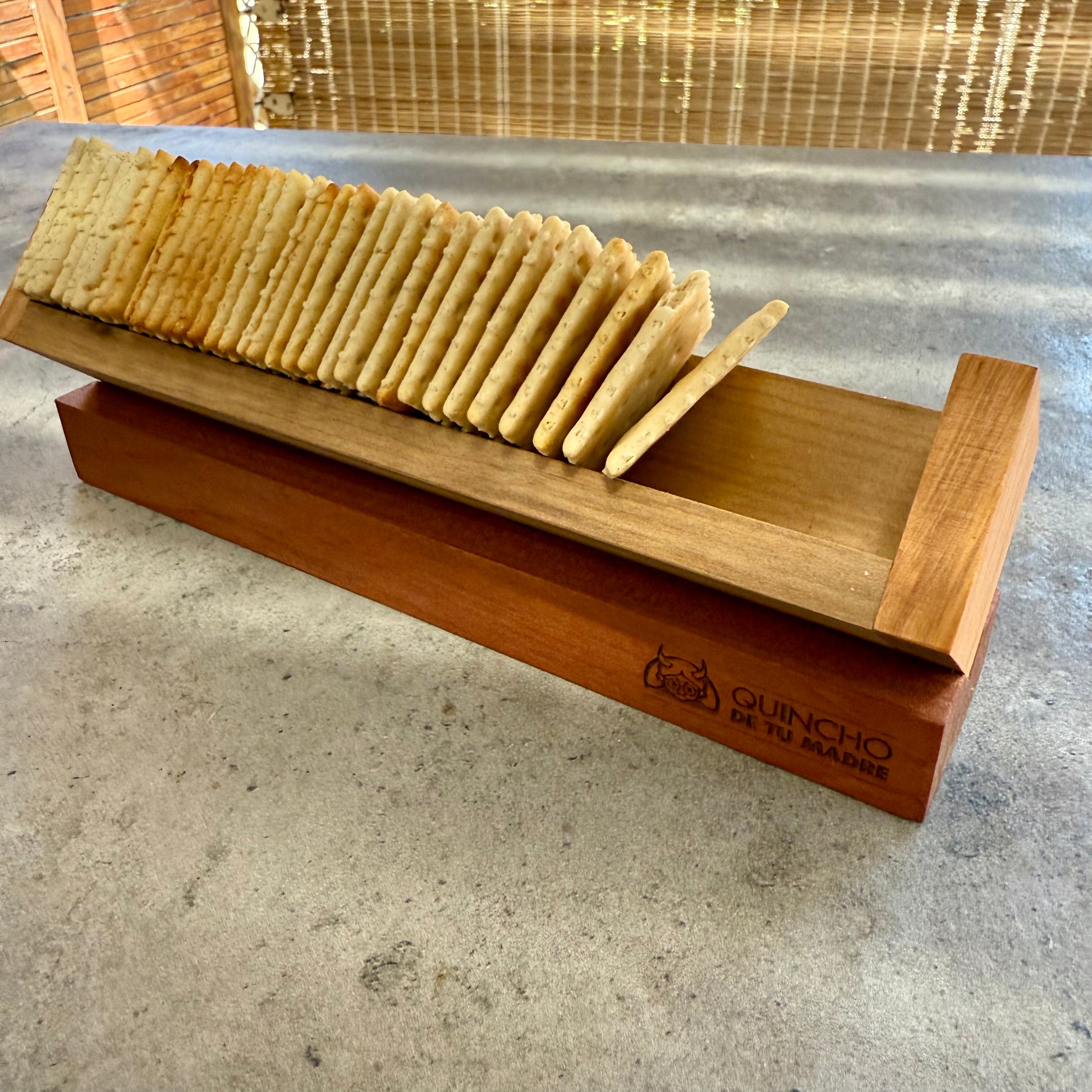 Nuestro portagalletas de madera nativa está diseñado para mantener todas tus crackelet y galletas de cóctel ordenadas, evitando que queden sueltas sobre la bandeja o tabla.